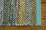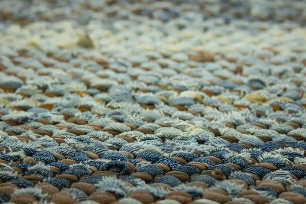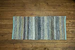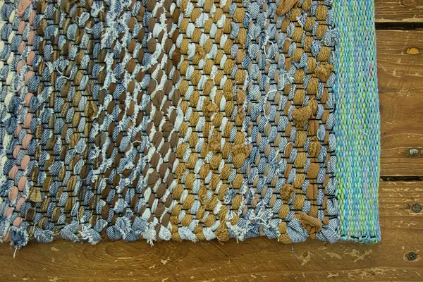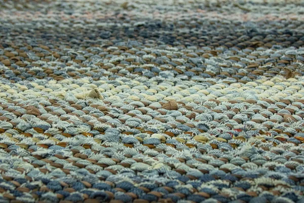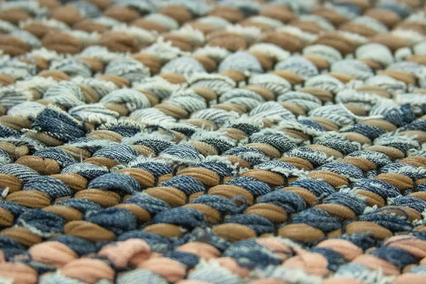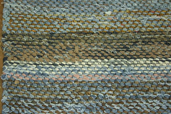 Kangastelgedel kootud toimne kaltsuvaip taaskasutustekstiilidest ja teksaribadest