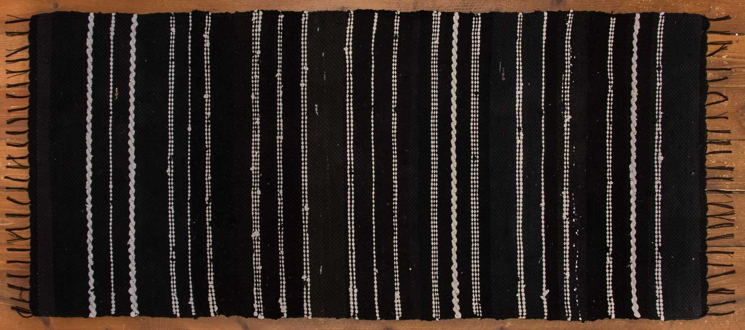 Väga klassikaline triibuline kaltsuvaip. Sobib absoluutselt igale poole. Ei väsita vaimu kogu oma neutraalsuses. Pane tähele, et triibud on tegelikult hallid, mitte valged. Innustust nii neutraalse vaiba kudumiseks sain Käsmu meremuuseumist, kus umbes samasugused on suurepäraseks taustaks väga ilusale merega seotud kremplile, st muuseumi väljapanekule. Sinna võiks küll igal suvel korraks sattuda.