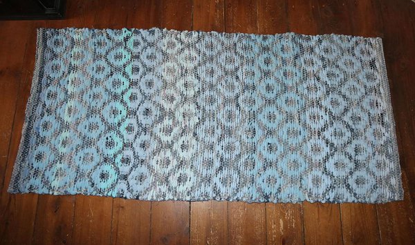 Kangastelgedel kootud kaltsuvaip 68 x 150 cm. Skandinaavia-pop kaltsuvaip. Meil tuntud kui daala-drell. Teksaribadega. Muster erineb veidi mõlemal pool.