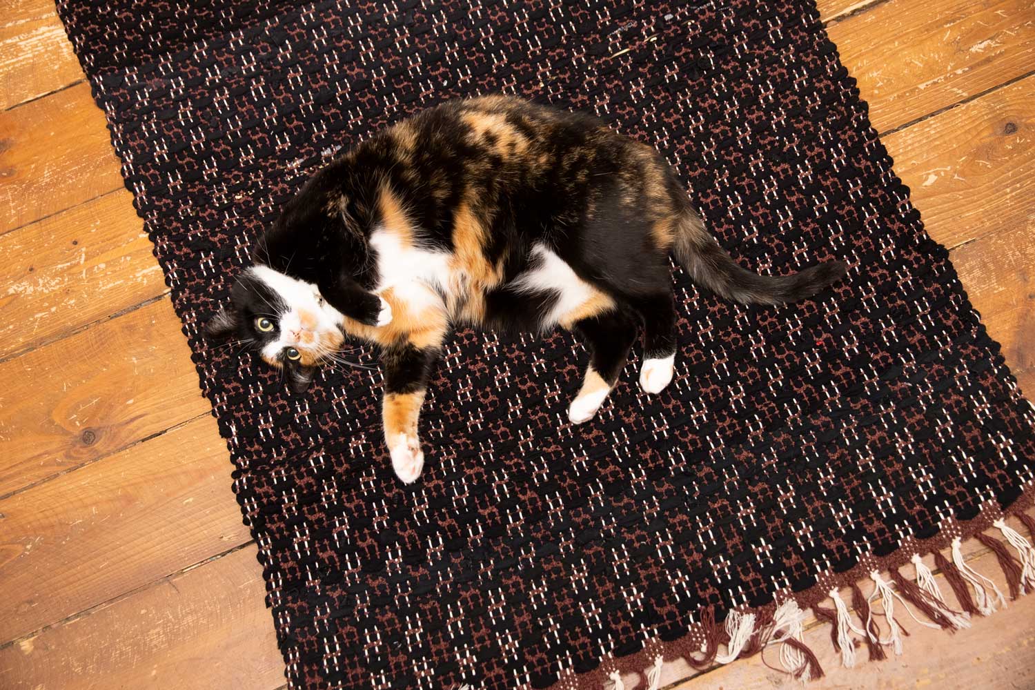 Kangastelgedel kootud õhem must nostalgiailmeline kaltsuvaip