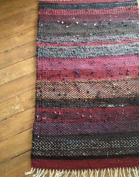 Kangastelgedel käsitsi kootud taaskasutusmaterjalidest narmastega kaltsuvaip