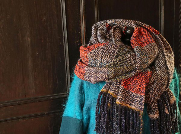 Tumesinisest tviidlõngast ja reipast oranžist, beežist ja rohelisest