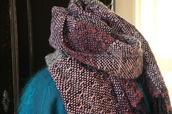 Talvekülma põskedest eemalhoidev suur sall. Tumesinine tviidlõng ja roosade värvivariatsioonidega kude, garanteerib prouadele kauni jume ja on tuulekindel kaitse, mütsi polegi väga vaja. 62 x 200 cm, lisaks narmad. Tõhus, aga mahe toode
