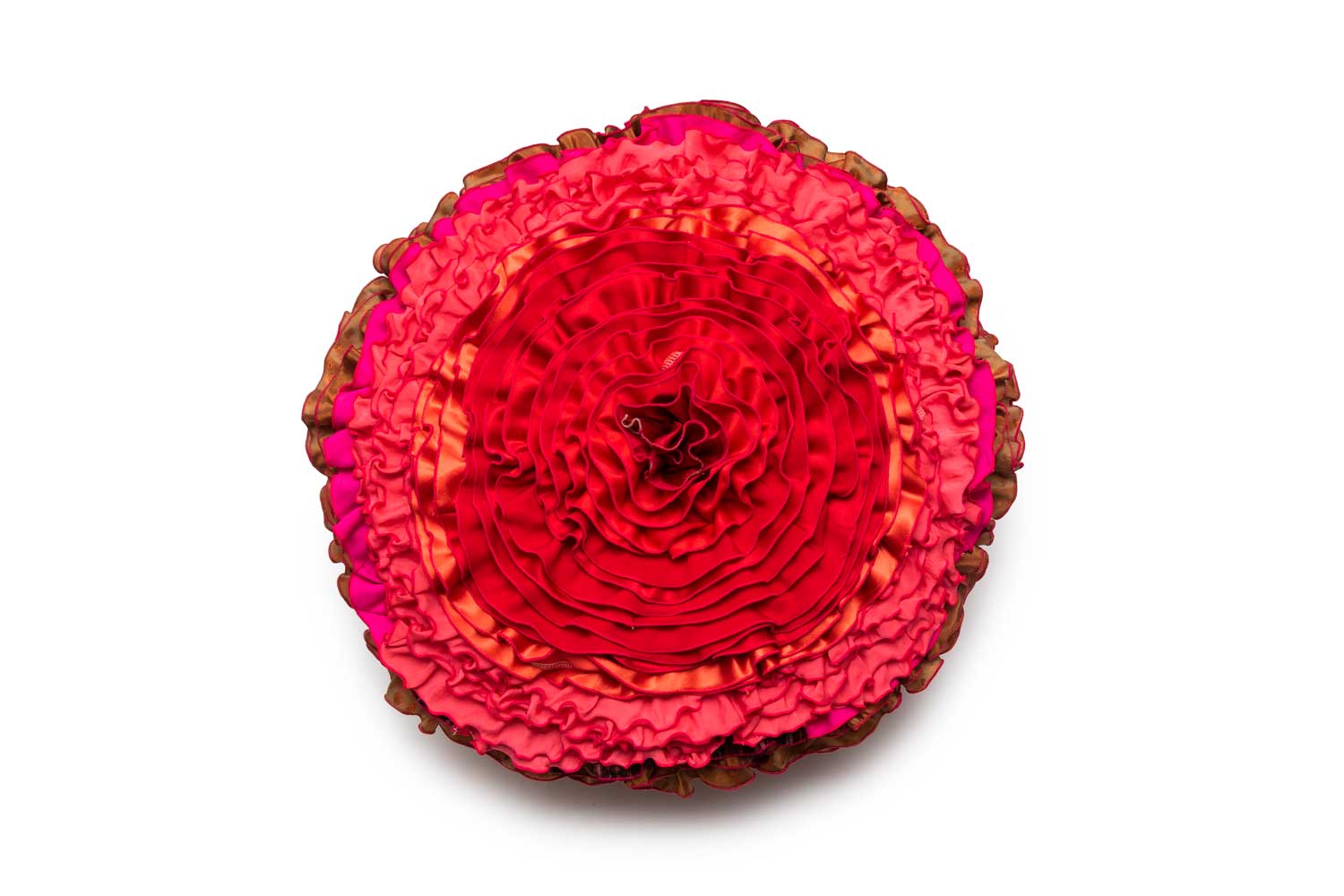 Round cushion witch dramatically red and pink decorative ruffles.