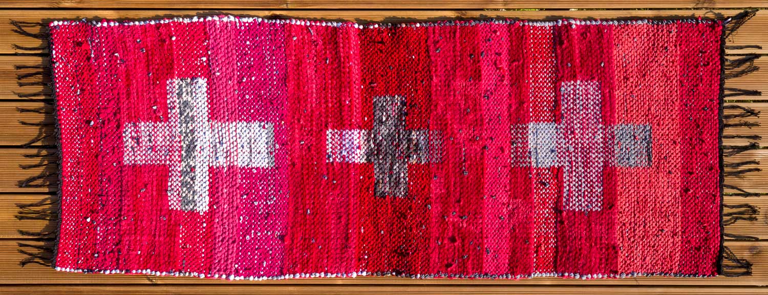 Simple rug with 3 different sized crosses. Crosses are never all one size. Some are lighter to carry. This ragrug is subtle grey on one side and dramatic red on the other. Thick and soft.