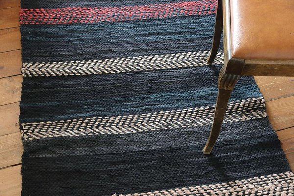 Synthetic warp, weft is made of black denim and recycled woollen sweaters. Not too heavy rug