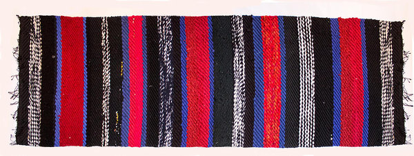 It was an extremely hot summer, sweat blurred my eyesight and vision. When I took the rug down from the loom it turned out that I had made an African skirt instead - wide stripes, simple and bright colors and the whole piece was strong with the warmth of The Hot Continent. This is A one tough rug!