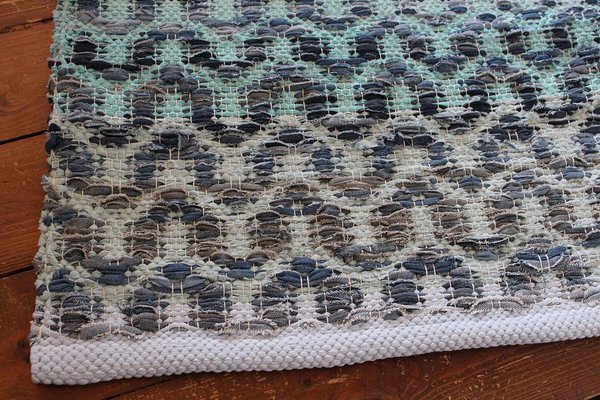 Cotton warp, recycled textiles and denim-stripes in Scandi-pop weaving style rug, no fringe. Not too heavy