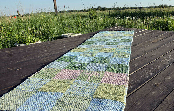 On this lively mild and pale green early summer rug you can notice a couple of peas and some blossoms. All of that on the backdrop of squares, or is it a trellis?