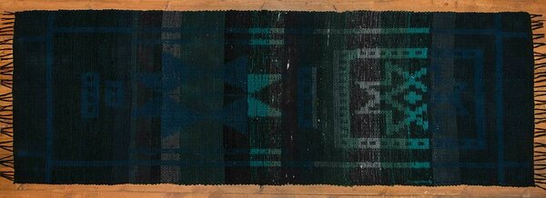 Commisioned dark rug with octagon pattern. The rug is so dark that dark gray actually makes the rug colourful! Inspiration came from the collection of patterned gloves at The Estonian National Museum. I used the hell-pattern of Halliste gloves, which is known to have particularly anti-evil properties. The original pattern has a zigzagging wormpattern and an octagonal star.