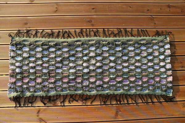 Soft, fluffy rug. Not recommended for hallways. Good for a bench or recliner.