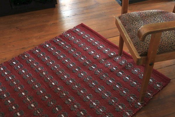 Handwoven light and warm area rug, made from wool and some whitish denim stripes. No fringe