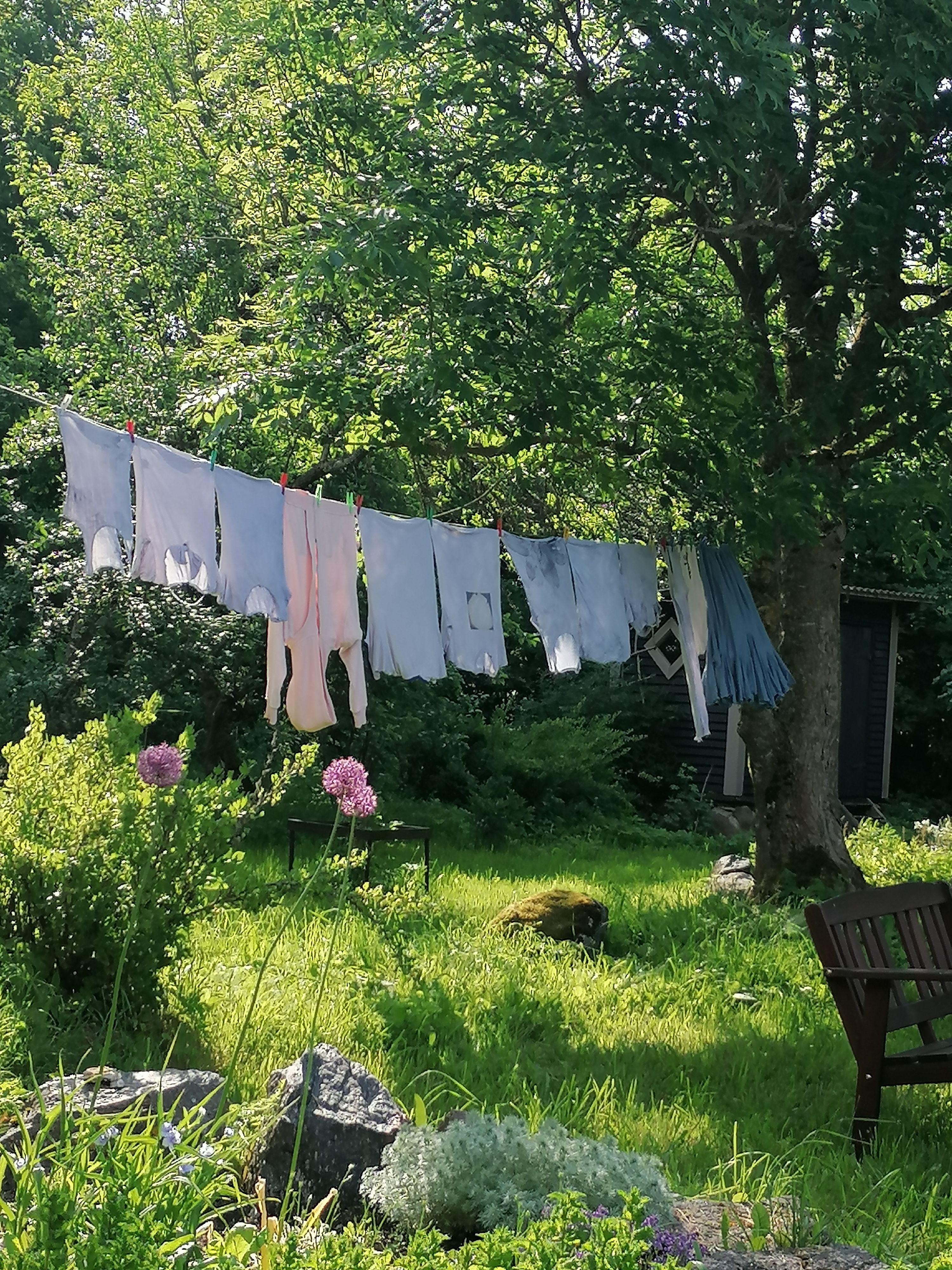 2. MULLE MEELDIB KANGAVÄRVIDEGA KATSETADA. Vaibamaterjali puhul pole veatu värvumine tähtis, oluline on saavutatud toon ja alanevad värviread. Kogun alatasa kokku kunagi valged olnud t-särgid, pusad jms ja värvin neid hulgi just seda värvi, mis parasjagu inspiratsiooni pakub. Harilikult jätkub värvilahusest mitme tõmmise tegemise jaoks ja särgi peal olnud pilt annab lisanüansi. Nii saan vaiba sisse tekitada erinevaid heleduse-tumeduse kontraste. Ja muidugi panna imeks, millistest värvikomponentidest kangavärv on kokku segatud ja mis viimasesse lahusesse lõpuks alles jääb (Vello Laumetsa Värvikoja sinepikollane kangavärv oli mu viimane mõtisklusaine). Kangavärvimine toimub 60-90 C juures. Seega värvitud kangad on läbi teinud ka korraliku kuumtöötluse